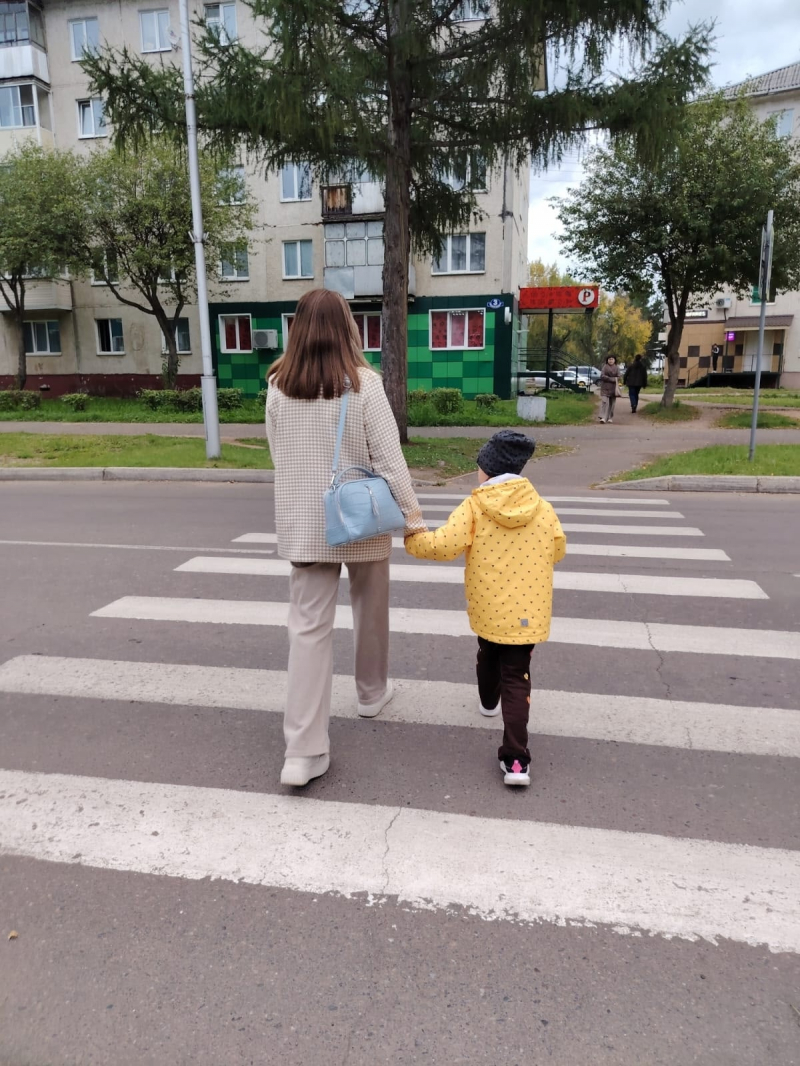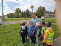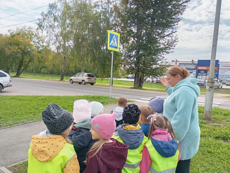 Надели яркие жилеты и отправились к пешеходному переходу. Вспомнили и повторили правила перехода через дорогу.