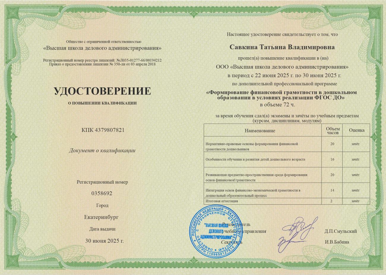 "Формирование финансовой грамотности в дошкольном образовании в условиях реализации ФГОС ДО",72 часа.